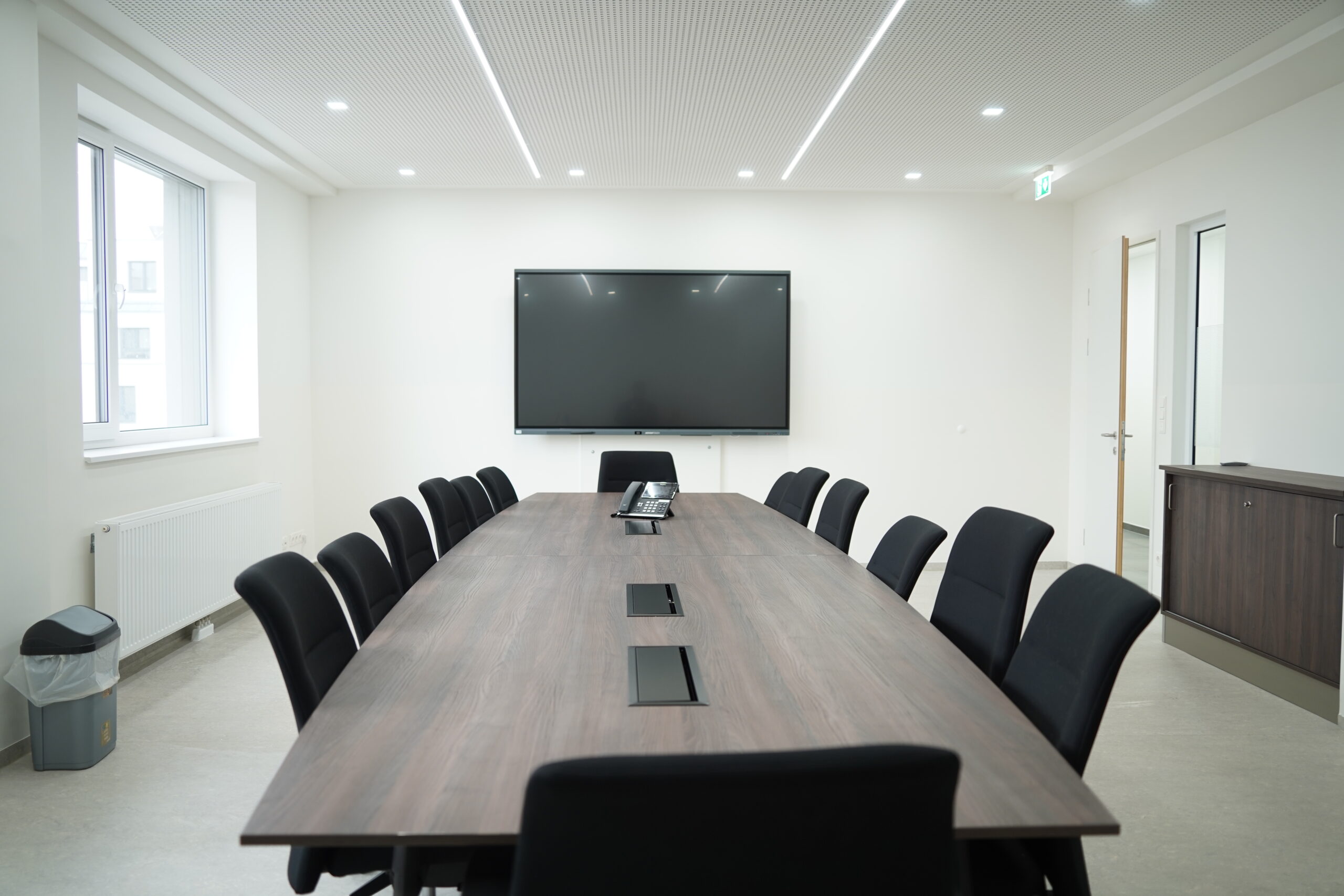 Dieser Raum ist als Meetingraum gestaltet und verfügt über einen zentral platzierten Tisch für 14 Personen. Ein interaktives Whiteboard ist vorhanden. Auf derselben Etage befindet sich eine gemeinschaftlich nutzbare Teeküche.